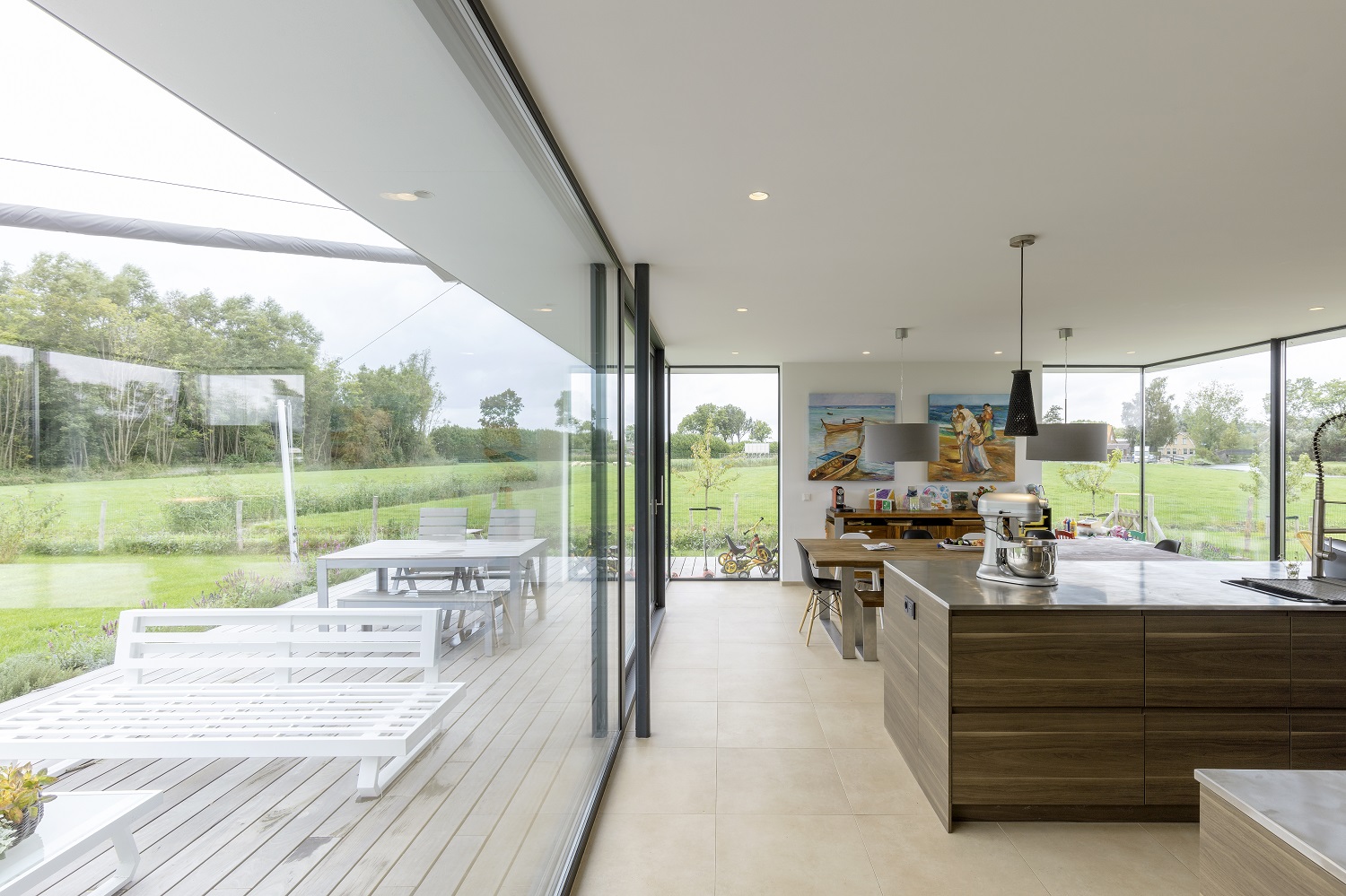 Het idee dat ik ooit als kind had, is met dit huis werkelijkheid geworden. Dankzij het vele glas heb je het gevoel dat je je in een cockpit bevindt, waarin je van drie kanten naar buiten kan kijken. Ondanks dat we dicht bij de bewoonde wereld zitten, hebben we een soort van vergezicht. We zien niet alleen het bos van Utrechts Landschap, maar kijken ook vrij weg, zo’n twee kilometer over de weilanden. Daarbij wisselt het uitzicht dankzij de seizoenen continue. Echt mooi.