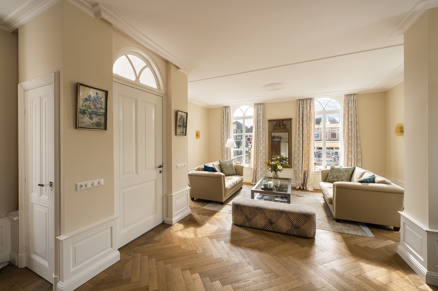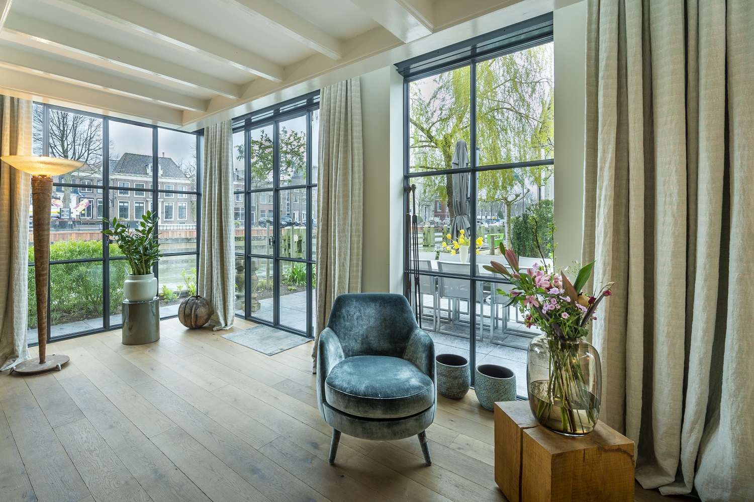 “In de gevel zit een plaquette die de historie beschrijft. Het sluishuis is een monument en staat op de meest markante plek van Muiden. Voordat mevrouw het kocht, vergaderden de hoge heren van het Waterschap er en was het nog niet bewoonbaar. Wij hebben het huis volledig gestript, van binnen opnieuw gebouwd en een aanbouw geplaatst. Bijzonder was dat de gevelklok aan de sluiszijde moest blijven lopen. Die geeft de tijd aan. Veel mensen rekenen daar schijnbaar op.