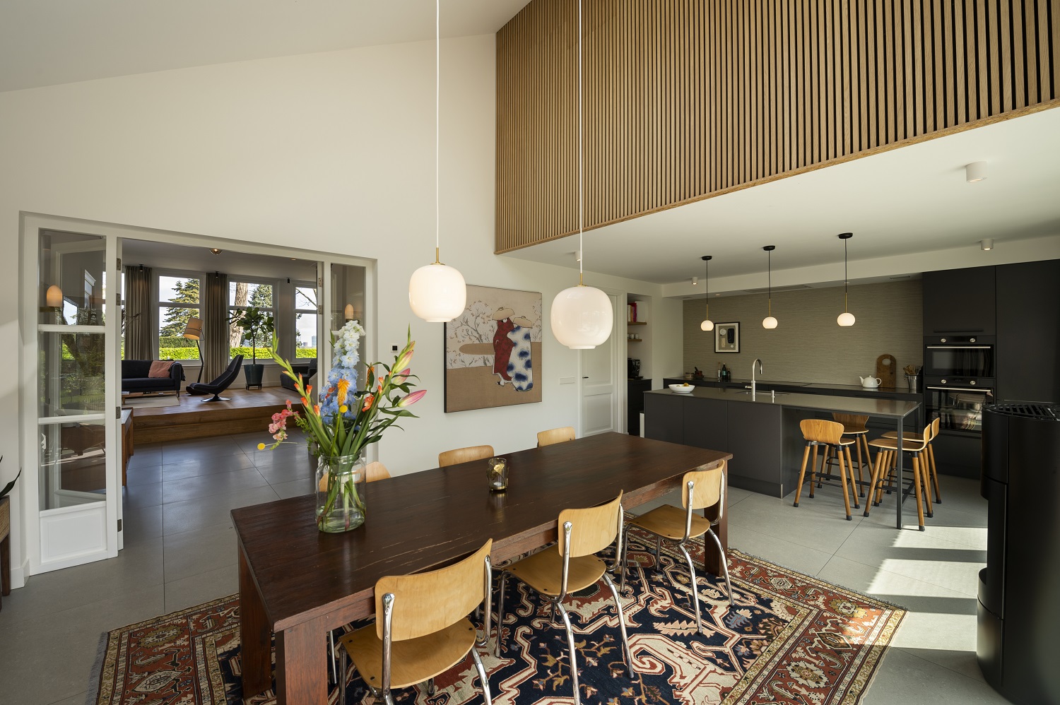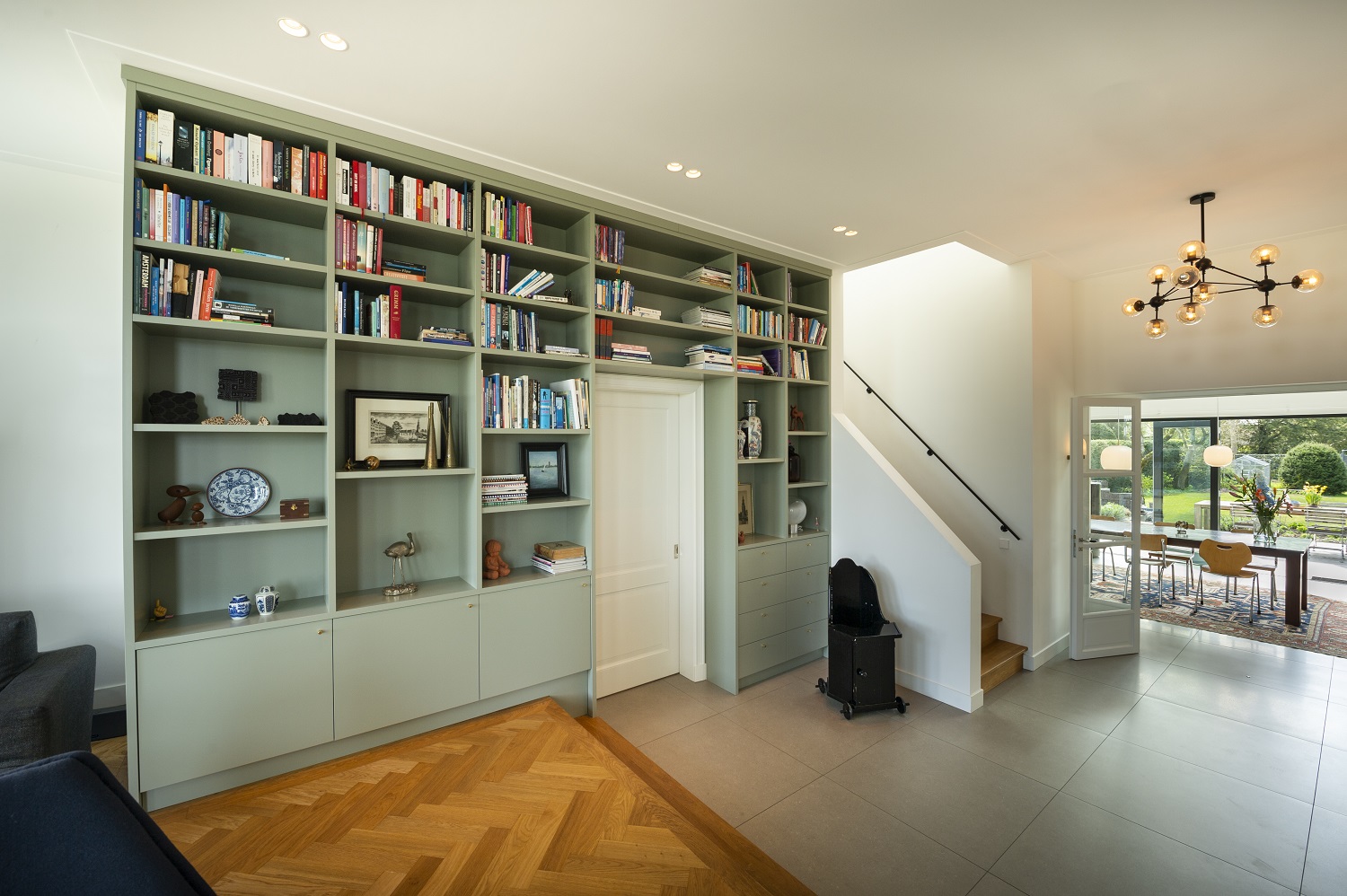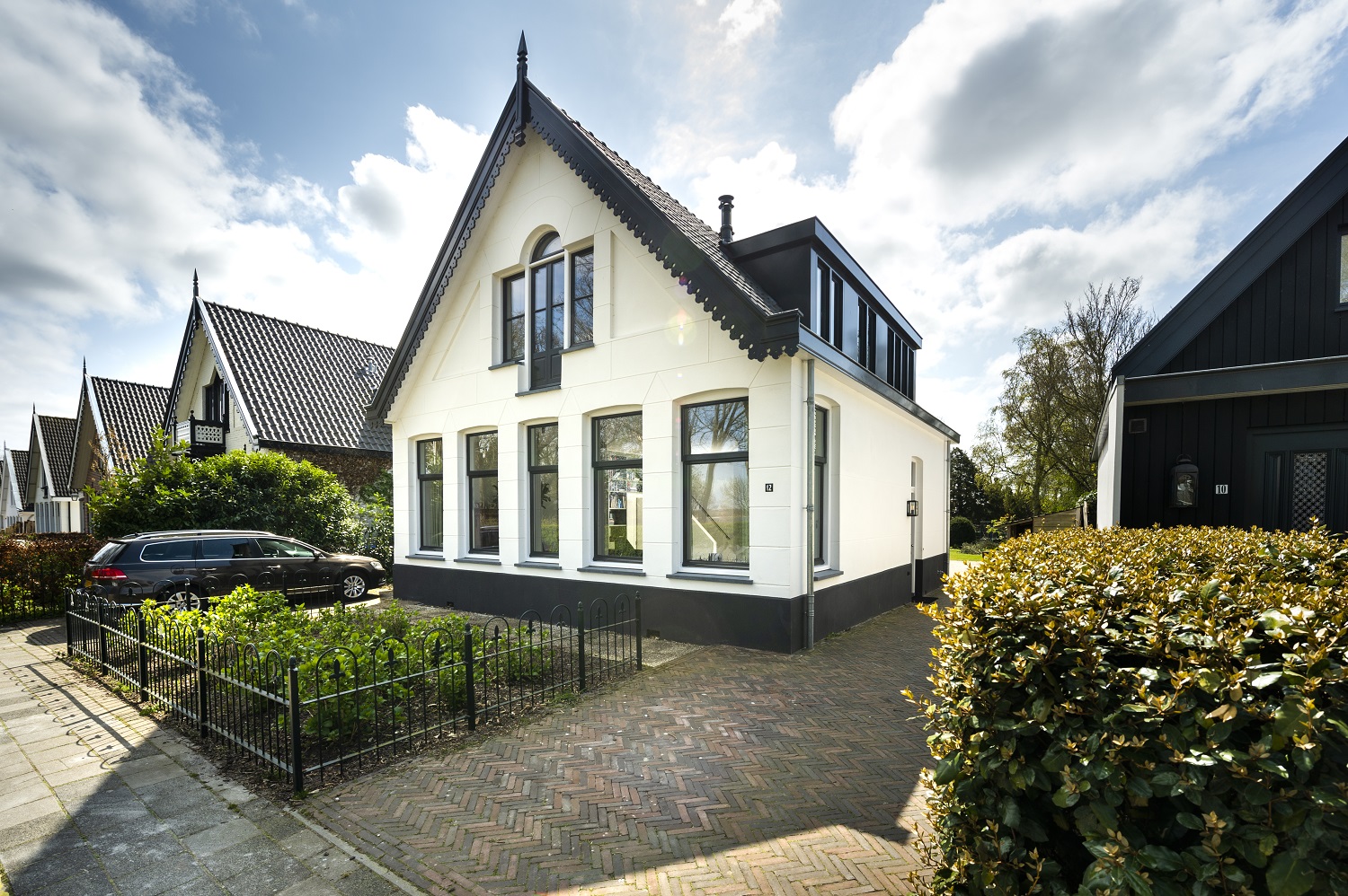 Daar er ook nog eens houtworm was het dak aan alle kanten lekte, bleek een grondige renovatie al snel de beste optie. Architectenbureau BNLA kreeg van ons de opdracht om het hoofdhuis in ere te herstellen, met dezelfde karakteristieke vorm in wit stucwerk als die van de 10 naastgelegen woningen in de straat. Voor de uitbouw aan de achterzijde koos de architect voor een contrasterend, modern uiterlijk in zwart hout. Echt mooi. Ondanks de verschillende vormen, oogt het huis als één geheel.