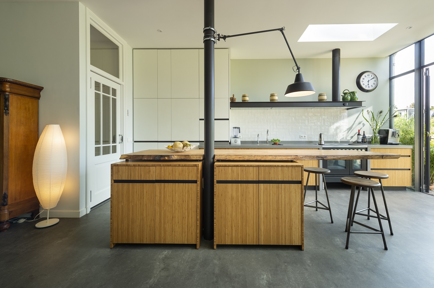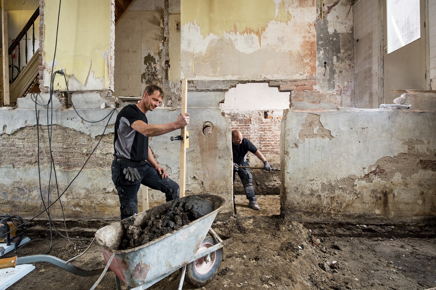 Er zijn veel mooie oplossingen bedacht. De uitbouw met een glazen pui bijvoorbeeld, die voor veel lichtinval zorgt. De trappen met gewelfde leuningen. Allemaal heel technisch, maar het meest ingenieuze was waarschijnlijk wel de verhoging van de vloer van gang, keuken en woonkamer met zo’n 40 centimeter. Daardoor zou het voor ons mogelijk worden om in het onderliggende souterrain rechtop te staan, de hoogte daarvan was maar 160 centimeter, en zou de leefruimte erboven een logischer breedte-hoogte verhouding krijgen, waardoor het huis fraaier werd. Prachtig bedacht allemaal, maar we moesten wel een aannemer zien te vinden die dat kon en zin in ons project had.